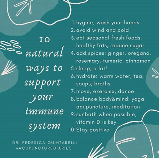 • L’alimentation : Trouver en premier lieu avant toute chose dans votre alimentation la façon optimale de vous nourrir. S’alimenter de choses saines oui, pour la santé, dans le calme, en conscience, et toujours avec plaisir, à heures régulière, loin du coucher (2h-3h). La cuisine, est un spectre très large qui va au-delà de la cuisson de l’aliment. Sa valeur énergétique commence dans l’intention avant même de l’avoir acheté. Nous nous nourrissons, de ce que nous mettons dans notre corps et dans notre esprit. Le produit acheté en magasin a toute une histoire, le faire cuire, le choix de la cuisson apporte aussi de l’énergie à l’aliment, la façon dont vous le préparez dans votre assiette, jusqu’à son trajet dans votre corps et vos cellules, et bien sûr les conditions dans lesquelles vous le mangez. En effet il est important de se nourrir bio et local, mais même l’aliment le plus sain, mangé dans de mauvaises conditions physiques ou psychologique peut devenir un poison. Dans l’alimentation, consommer d’avantage du vivant en fruits et légumes (qui représentent plus de la moitié de votre assiette), des produits les moins transformés possibles. Exit l’industrialisé pauvre en nutriments et vitamines essentiels, ces plats industrialisés ne sont que des compositions chimiques, loin d’être de la cuisine et faire du bien à notre corps. Les omégas 3 sont excellents pour notre corps avec l’huile de lin, de noix, de cameline, les poissons gras, les noix… Puis, nous pouvons trouver également dans l’alimentation le ginseng, véritable tonique général utilisé dans la médecine traditionnelle chinoise, l’échinacée anti-infectieuse et immune-stimulante utilisée pour réduire la durée d’un rhume et atténuer les symptômes. Pensez aussi aux pro et prébiotiques contenus aussi dans les aliments. Pensez aux plantes sources de vertus et de bienfaits naturels, en infusion, dans vos plats… les produits de la ruche ou apithérapie également en respectant les abeilles et leur travail (propolis, cure de pollen cure gelée royale…)…